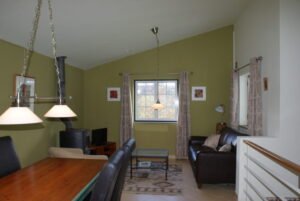 • Large open and well equipped kitchen consists of a 5-burner induction cooktop and electric stove, refrigerator/freezer and a dishwasher. Stairs continue down to another level where the bedroom is located